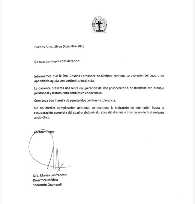 La expresidenta Cristina Fernández de Kirchner continúa internada en el Sanatorio Otamendi, donde se recupera de una apendicitis aguda con peritonitis localizada, según informó este lunes el último parte médico oficial. El informe indica que la evolución clínica es favorable, aunque el proceso de recuperación avanza de manera paulatina y bajo estricta supervisión médica.