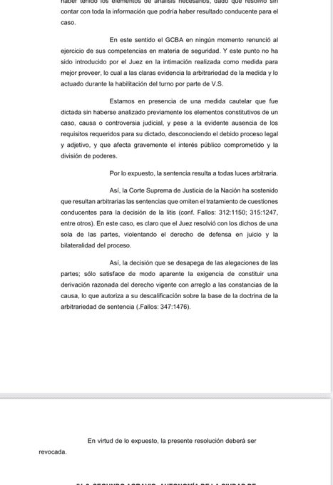 Así, el Gobierno de la Ciudad de Buenos Aires, pidió que se revoque el fallo de Gallardo, al que consideró “nulo” en virtud de los siguientes argumentos:  y solicitó que se eleve en forma urgente a la Cámara del fuero en lo Contencioso Administrativo, Tributario y de Relaciones de Consumo para el tratamiento ante la inminencia de la marcha y movilización anunciada para mañana.