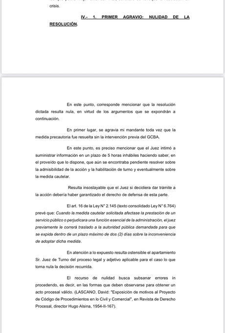 “En primer lugar, se agravia mi mandante toda vez que la medida precautoria fue resuelta sin la intervención previa del GCBA.