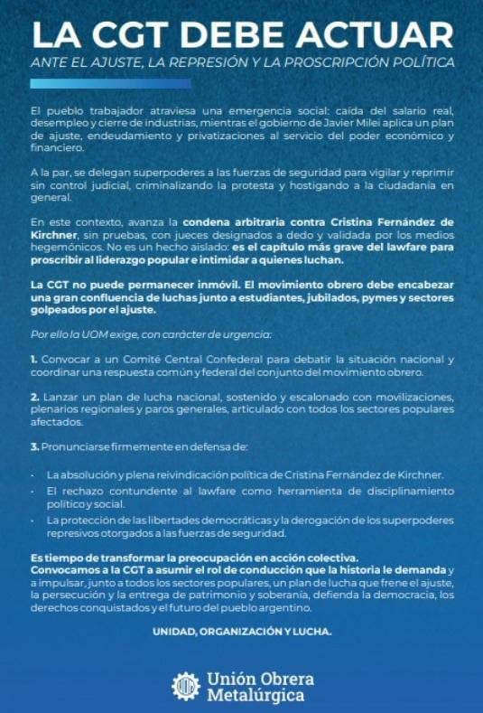 En una jornada cargada de volumen político con la marcha en favor de Cristina Kirchner como protagonista, un comunicado de la Unión Obrera Metalúrgica sacudió el ámbito sindical debido a que crítica de manera contundente a la Confederación General del Trabajo.