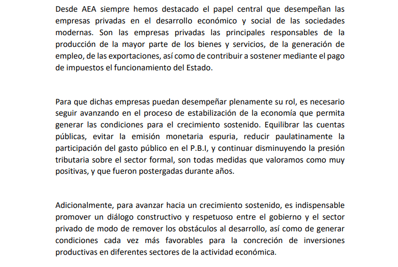 “Desde AEA siempre hemos destacado el papel central que desempeñan las empresas privadas en el desarrollo económico y social de las sociedades modernas. Son las empresas privadas las principales responsables de la producción de la mayor parte de los bienes y servicios, de la generación de empleo, de las exportaciones, así como de contribuir a sostener mediante el pago de impuestos el funcionamiento del Estado” comienza señalando el mismo.