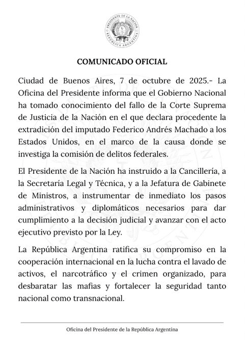 La Oficina del Presidente de la República Argentina informó este martes que el Gobierno Nacional acatará el fallo de la Corte Suprema de Justicia de la Nación que declaró procedente la extradición de Federico Andrés Machado a los Estados Unidos, donde está acusado por delitos federales vinculados al lavado de dinero, narcotráfico y crimen organizado.