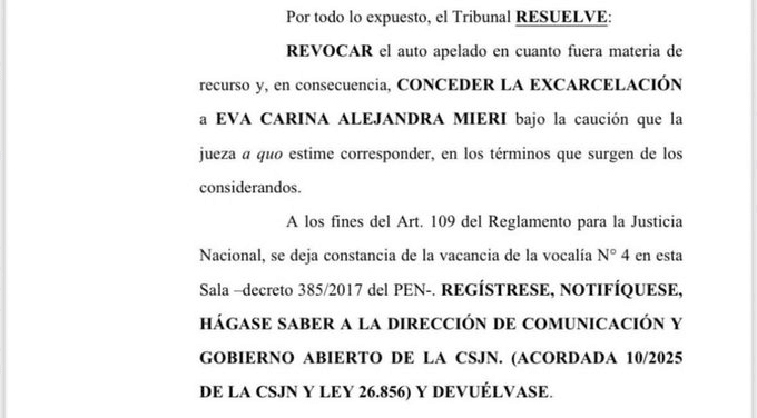 Mieri, llevaba detenida 14 días, y la habían trasladado a la cárcel de Ezeiza. Además, en el fallo se redujo la caución para Alexia Abaigar, quien se encuentra con prisión domiciliaria.