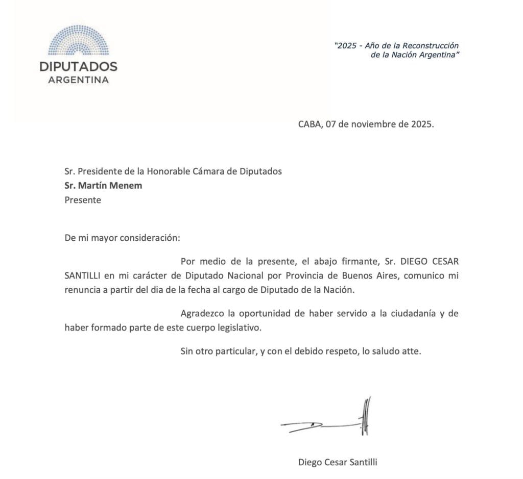 “Por medio de la presente, el abajo firmante, Diego Santilli en mi carácter de Diputado Nacional por Provincia de Buenos Aires, comunico mi renuncia a partir del día de la fecha al cargo de Diputado de la Nación” comienza señalando el comunicado emitido por el propio Santilli a Martín Menem, presidente de la Cámara.