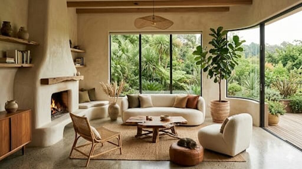 - Espacios envolventes: Un sillón curvo o una alfombra circular actúan como anclas visuales que invitan a la pausa.