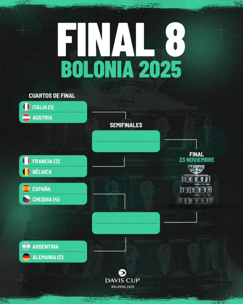 La Selección Argentina de tenis conducida por Javier Frana, ya conoce a su rival en los cuartos de final de la Copa Davis 2025: será nada menos que Alemania, segundo cabeza de serie, en un cruce que se disputará en Bolonia entre el 18 y el 23 de noviembre.