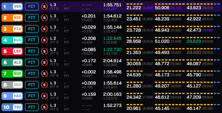 Para la Q2: Se disputaron los tiempos entre los posibles campeones: Lando Norris, Max Verstappen y Oscar Piastri. Sin embargo, se coló otro gran piloto como George Russell, que lideró esta segunda clasificación.