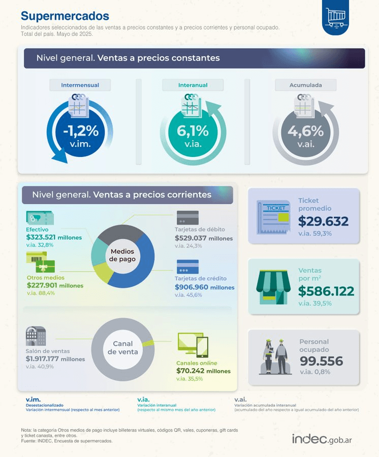 En las ventas totales a precios corrientes, durante mayo de 2025, los grupos de artículos con los aumentos más significativos, según su variación interanual, fueron: “Alimentos preparados y rotisería”, con 69,0%; “Carnes”, con 68,7%; “Indumentaria, calzado y textiles para el hogar”, con 53,2%; y “Electrónicos y artículos para el hogar”, con 48,1%.