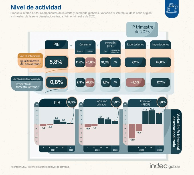 Según informó el Instituto de Estadística y Censos (INDEC), el producto interno bruto (PIB) desestacionalizado del primer trimestre de 2025, con respecto al cuarto trimestre de 2024, registra un aumento de 0,8% en términos desestacionalizados respecto al cuarto trimestre del año anterior, mientras que la tendencia-ciclo muestra una variación de 1,4%.
