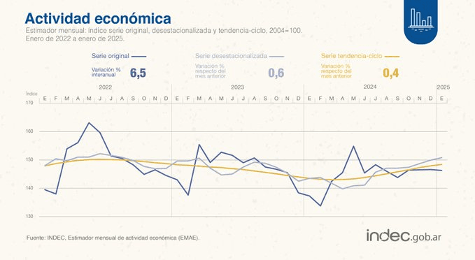 En enero de 2025, el estimador mensual de actividad económica (EMAE) registró una suba de 6,5% en la comparación interanual (ia) y de 0,6% respecto a diciembre en la medición desestacionalizada (s.e.).