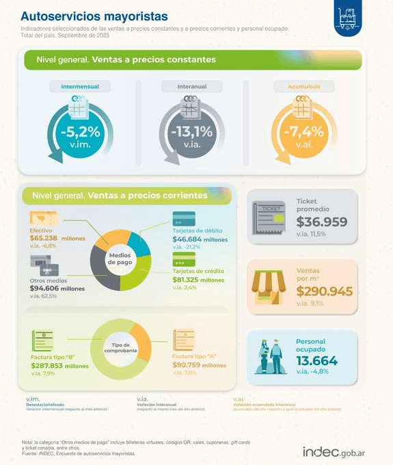 El consumo masivo volvió a mostrar señales de retracción en septiembre de 2025. Las ventas en autoservicios mayoristas registraron una caída del 13,1% interanual a precios constantes, profundizando una tendencia negativa que se sostiene desde principios de año.