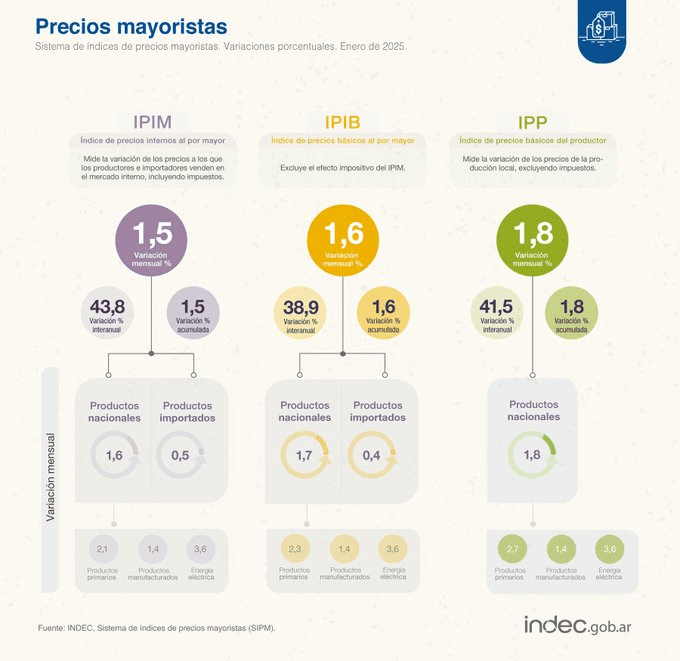 Según el INDEC el nivel general del Índice de precios internos al por mayor (IPIM) registró un aumento de 1,5% en enero de 2025 respecto del mes anterior, estando nuevamente por debajo de la inflación. De todos modos, casi duplicó la del mes anterior que había sido del 0,8%.
