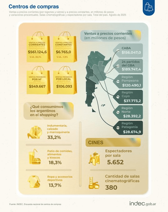 Según el INDEC, las ventas en los centros comerciales registraron en agosto de 2025 su nivel más bajo en la serie desestacionalizada desde diciembre del año pasado. Aunque el monto total a precios corrientes creció un 25,1% interanual, las ventas medidas a precios constantes mostraron una caída del 1,9% respecto al mismo mes de 2024.