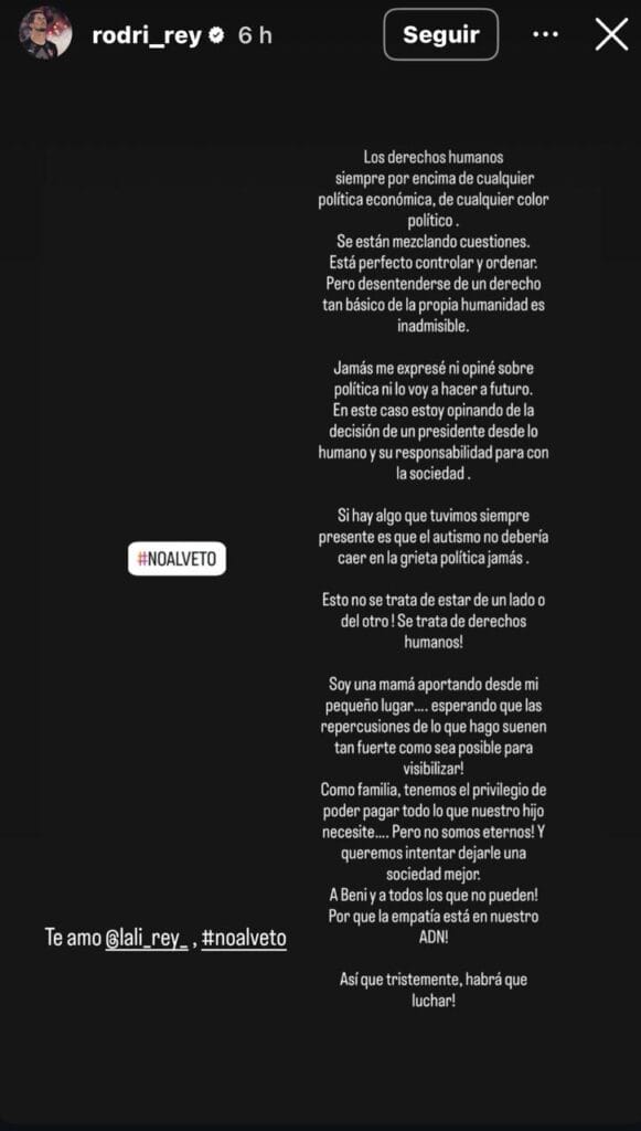 El arquero de Independiente Rodrigo Rey, compartió una carta que publicó su esposa Mila, en el marco del veto del presidente Javier Milei, con respecto a la ley que declaraba la emergencia en discapacidad. Benicio, el hijo de Mila y Rodrigo, fue diagnosticado con Trastorno del Espectro Autista.