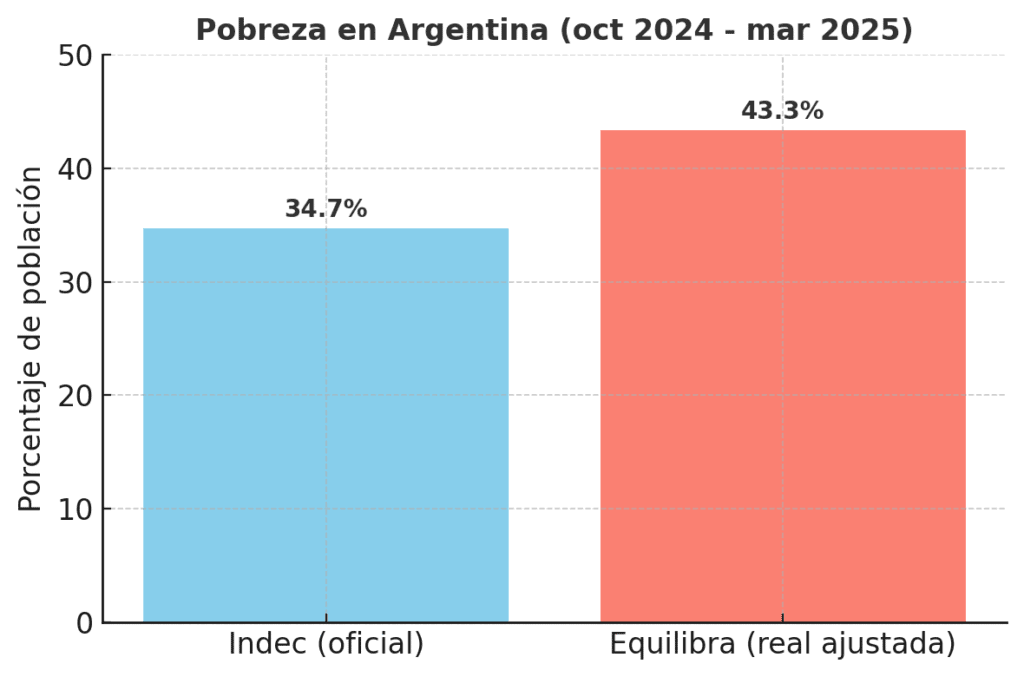 El último informe de la consultora Equilibra encendió todas las alarmas: mientras el INDEC informó una tasa de pobreza del 34,7%, la medición ajustada de la consultora marca que el número real trepa al 43,3%, casi 9 puntos más.