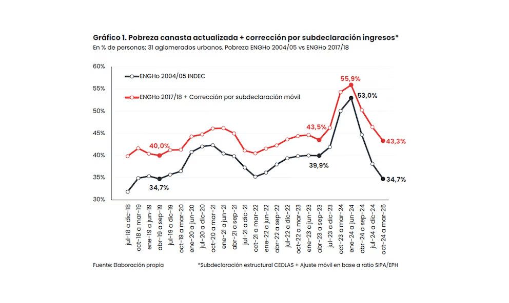 Según el informe, esta doble distorsión lleva a que la pobreza oficial esté subestimada. Al corregir ambos factores, la tasa se ubica en 43,3% para marzo de 2025.
