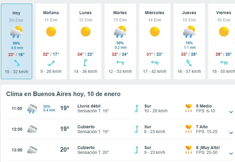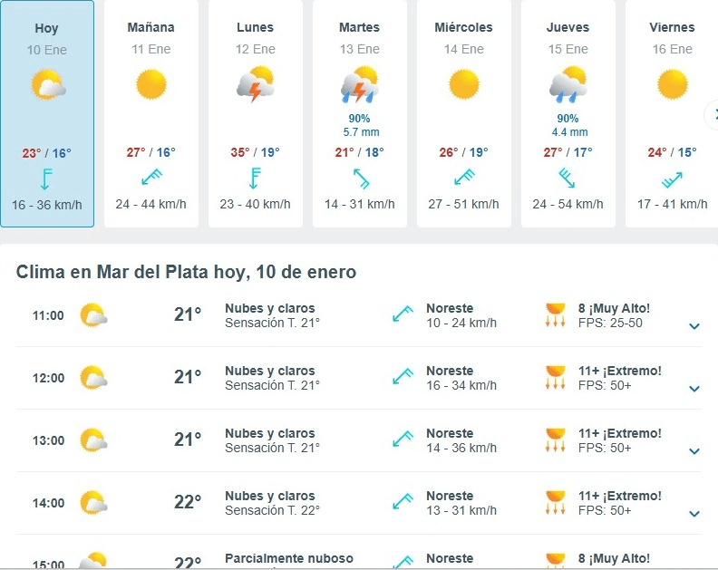 En tanto, el pronóstico para Mar del Plata indica que este sábado 10 de enero la jornada se presenta con cielo mayormente nublado durante la mañana, sin lluvias y con una temperatura que ronda los 19 grados. Los vientos soplan del norte a velocidades de entre 13 y 22 km/h, con una humedad elevada, cercana al 99%, y buena visibilidad. El sol salió a las 5:40 y se pondrá a las 20:16.